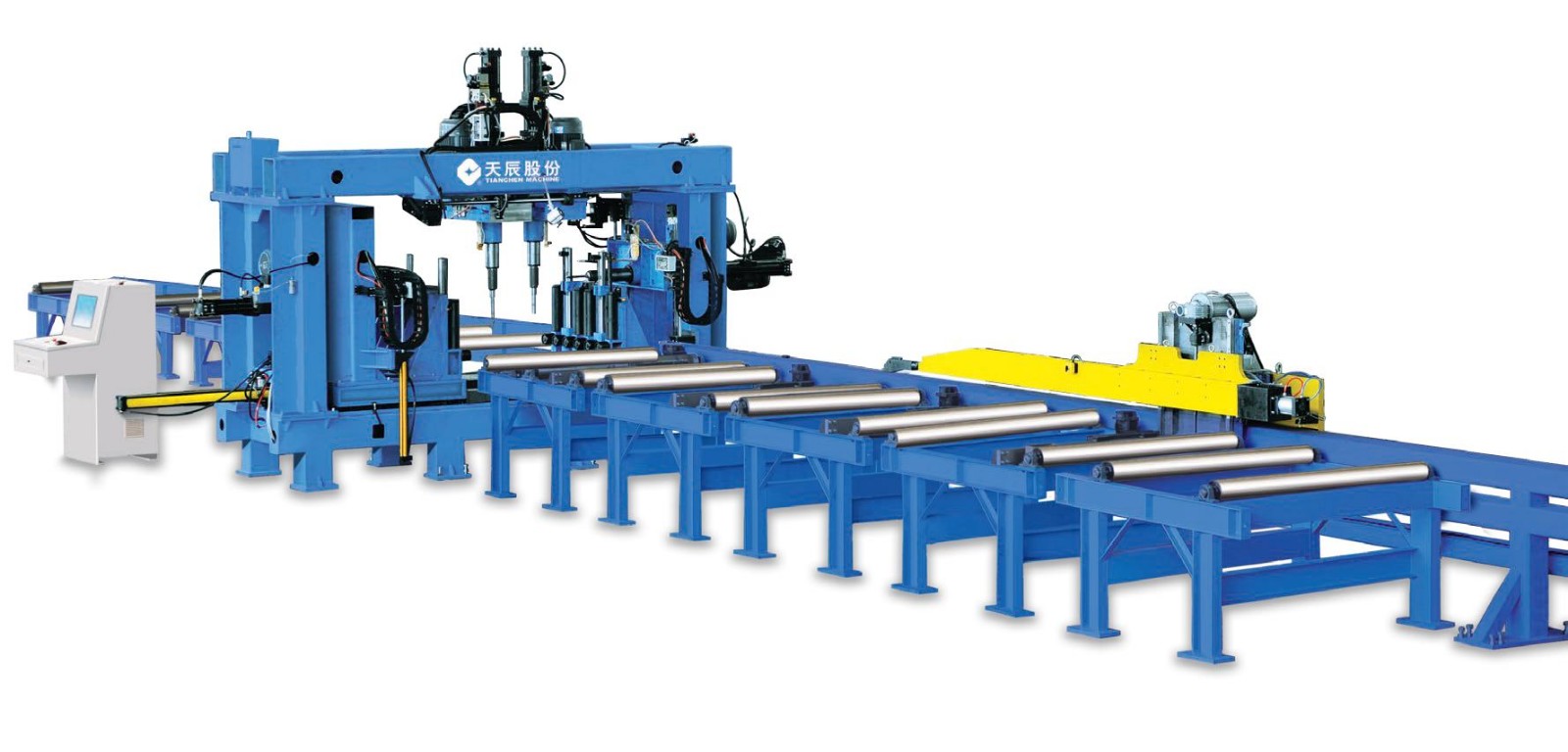 本機(jī)床主要用于對(duì)H型鋼、槽鋼、方管和矩形管等型鋼進(jìn)行鉆孔加工,它主要應(yīng)用于鋼結(jié)構(gòu)建筑、橋梁、電站、海洋石油井平臺(tái)、塔桅等鋼結(jié)構(gòu)行業(yè)。機(jī)床一共采用4個(gè)主軸: 左單元和右單元各有1個(gè)主軸分別對(duì)型鋼的兩個(gè)翼板進(jìn)行鉆孔加工;上單元有2個(gè)主軸,對(duì)型鋼的腹板進(jìn)行鉆孔加工。上單元能裝夾2種不同直徑的鉆頭,可以同時(shí)加工腹板上兩種不同直徑的孔。和腹面上只有單個(gè)主軸的機(jī)床相比,當(dāng)腹板孔徑變化時(shí)不需要手工更換鉆頭,因此該機(jī)床大大節(jié)省了換刀時(shí)間,顯著提高了加工效率和加工精度。該機(jī)床是我公司專(zhuān)利產(chǎn)品